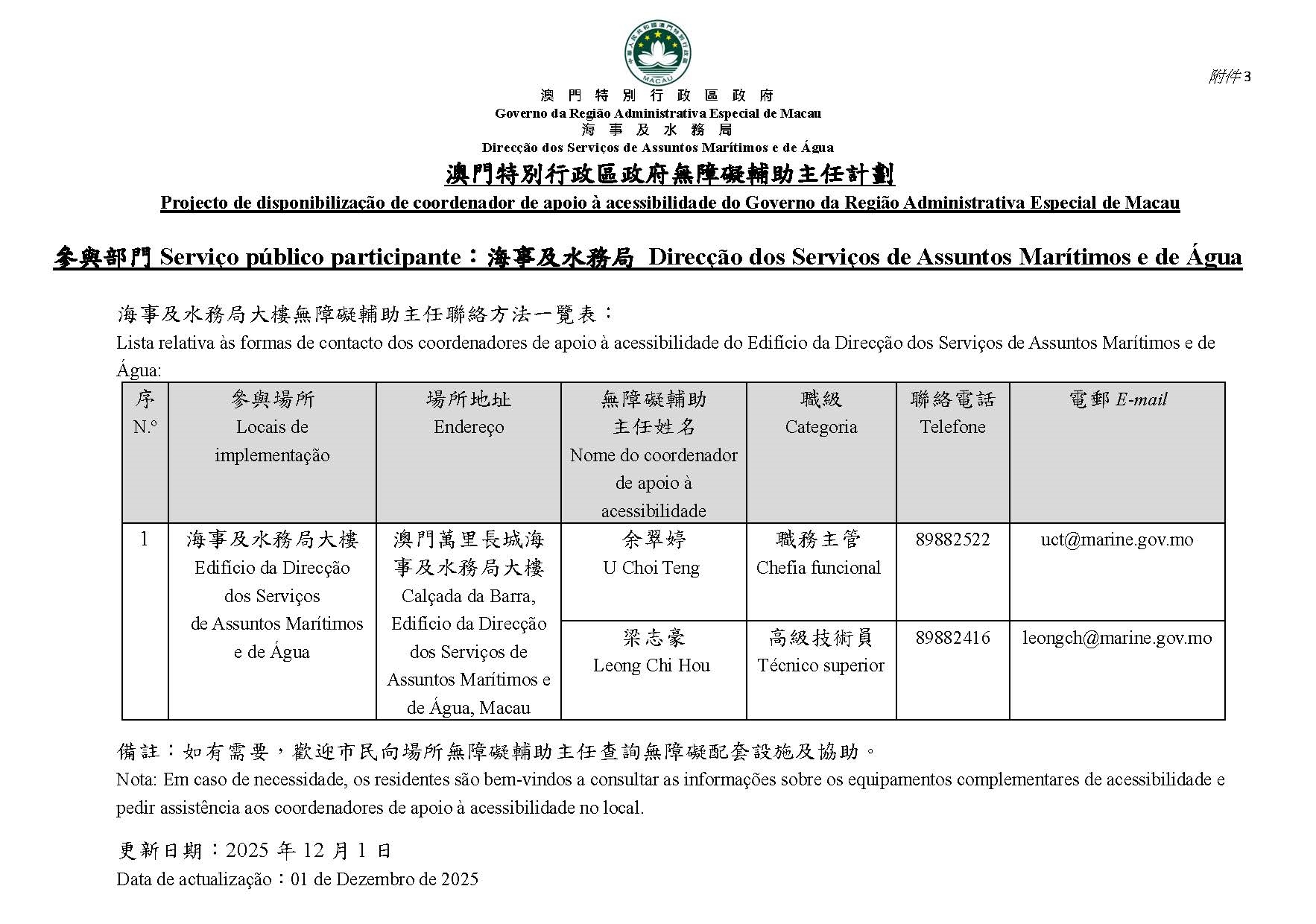 地址:澳門萬里長城海事及水務局大樓(郵政信箱47號)