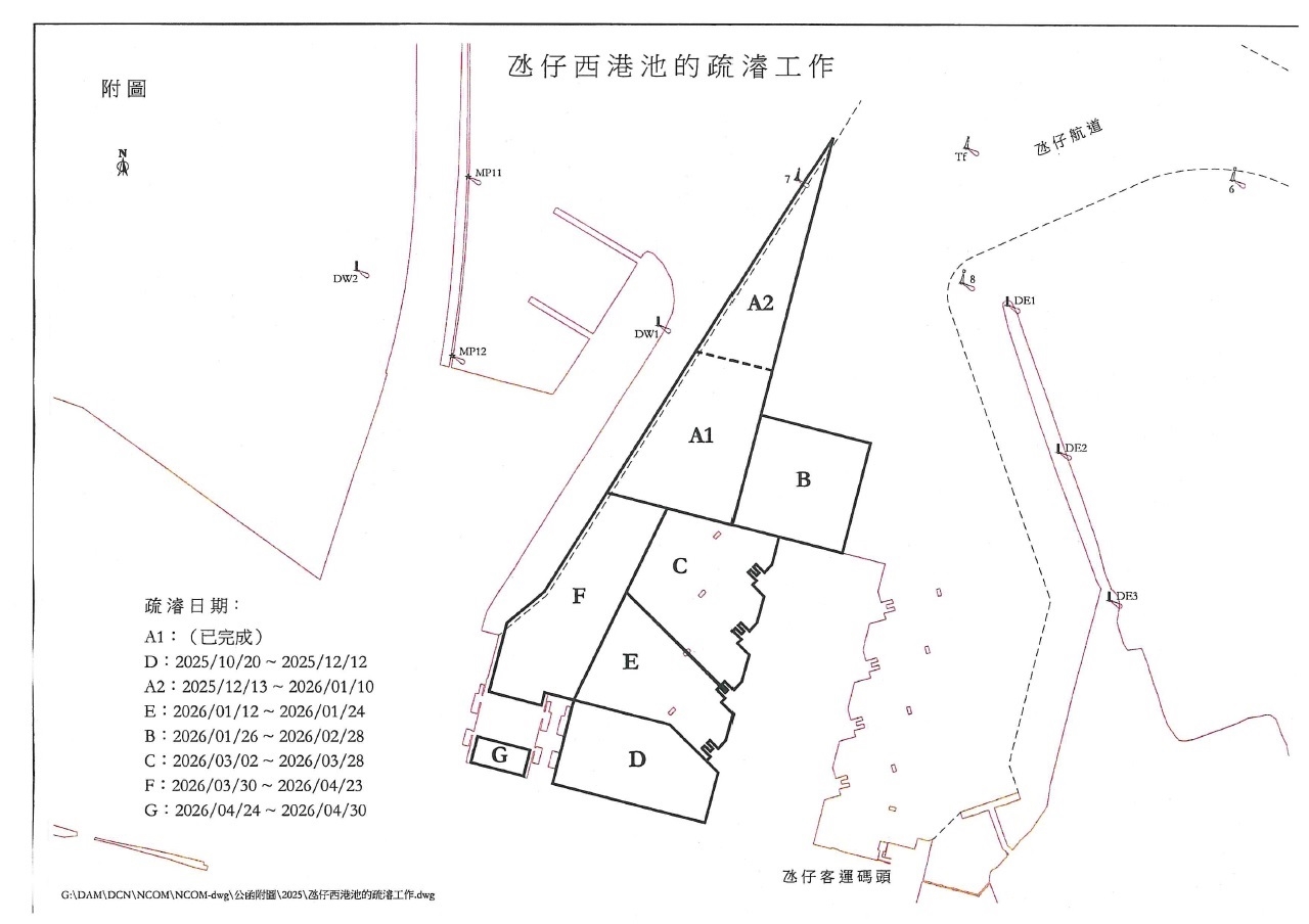 由2025年10月22日起至2026年4月30日(不包括星期日及節假日期間),於氹仔客運碼頭西港池分階段進行疏濬工程;