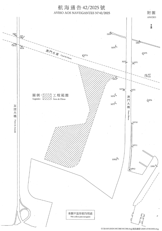 - 由2025年10月28日起至2026年10月26日,於澳門水道與E1區之間的水域海面,有海事工程進行;