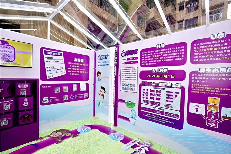 路環再生水站一期工程即將竣工,經調試站內再生水儲水池、泵房和過濾設備後可投產,供水能力為每日2,500立方米,將供應再生水予石排灣公屋及澳門大學,用於沖廁及綠化,水質符合安全標準,而且澳門自來水股份有限公司會每日檢測及於網上公佈檢驗結果,確保安全衛生。