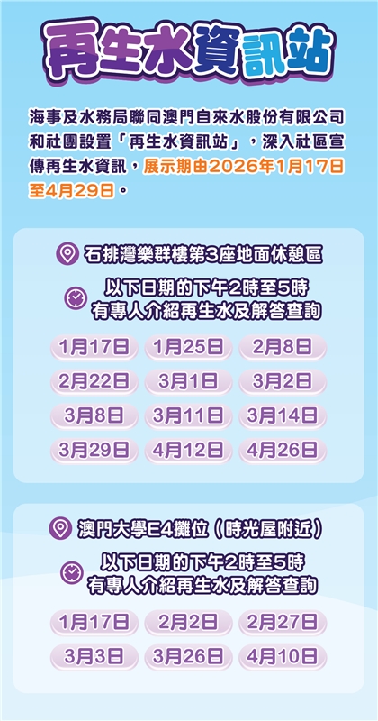 二月期間,海事及水務局及澳門自來水股份有限公司將繼續於指定日期的下午2時至5時,派出專員駐場解答居民查詢,並聽取居民意見。其中,設於澳門大學E4劉少榮樓的“再生水資訊站”專員駐場日期為2月2日及27日;設於石排灣樂群樓第3座休憩區的“再生水資訊站”專員駐場日期則為2月8日及22日。現場設有互動遊戲及資訊展板,歡迎居民到場參觀了解再生水資訊。詳情可瀏覽海事及水務局網站www.marine.gov.mo。