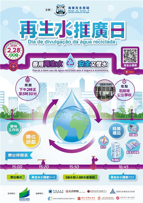 “再生水推廣日”將於2月28日(週六)下午2時至5時30分在石排灣公立學校地面層舉行。活動現場設有攤位遊戲、工作坊、專題講座以及諮詢服務,還有廣受學生歡迎的《威水超人》節水宣傳劇上演。歡迎居民到場參與活動,完成指定項目更有機會獲得精美紀念品。活動詳情可瀏覽海事及水務局網站www.marine.gov.mo的“再生水專頁”。