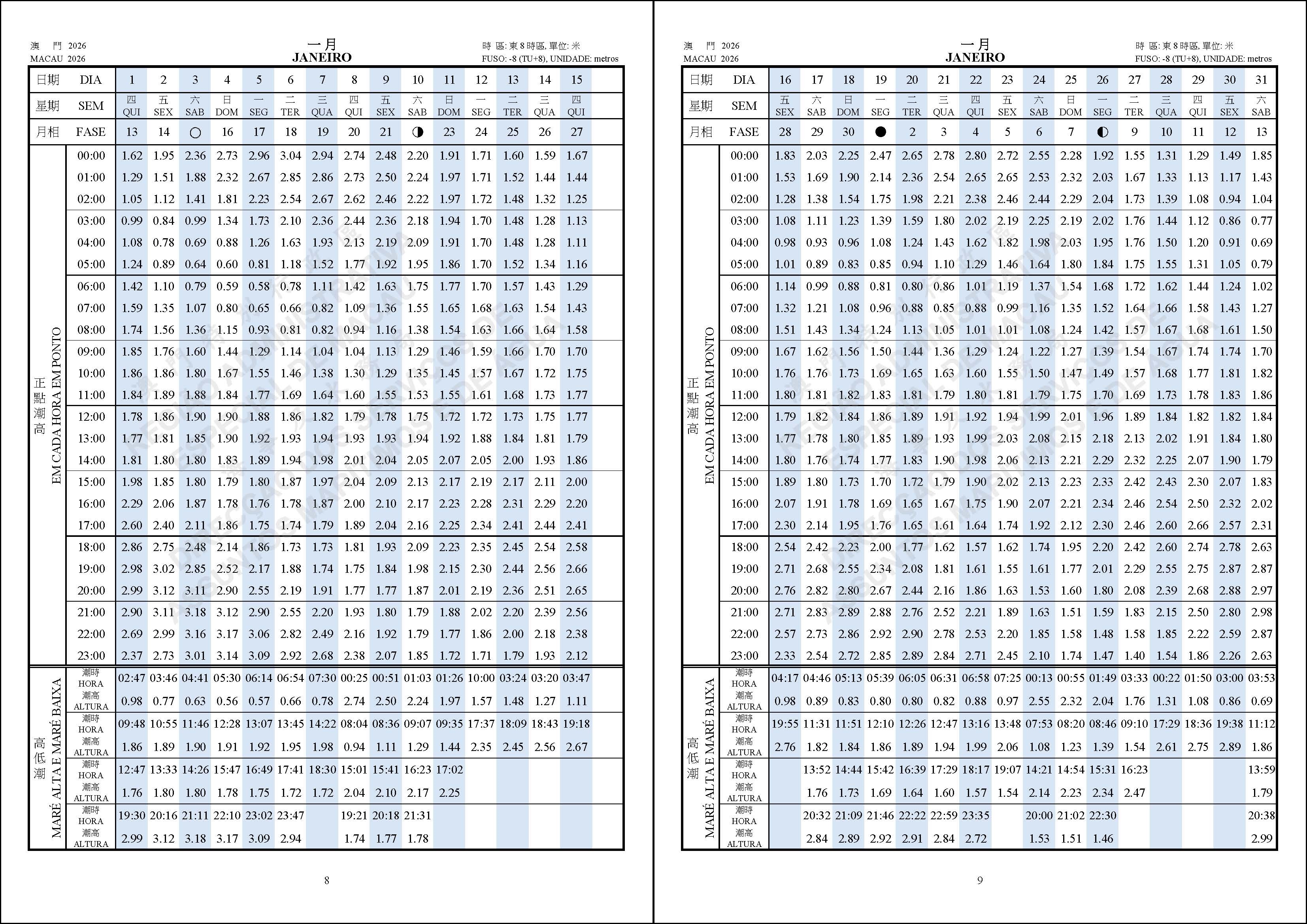 澳門海事及水務局會採用內港潮汐站長期記錄的潮汐資料,撇除惡劣天氣影響的潮位,以調和法分析計算製作潮汐表,供海事業界使用,讓業界可按照潮汐狀況駕駛船隻,保障航行安全。為進一步優化便民措施,在海事及水務局網頁、澳門海事手機應用程式及微信公眾號提供免費下載電子版《潮汐表》,以便公眾自行下載查閱。