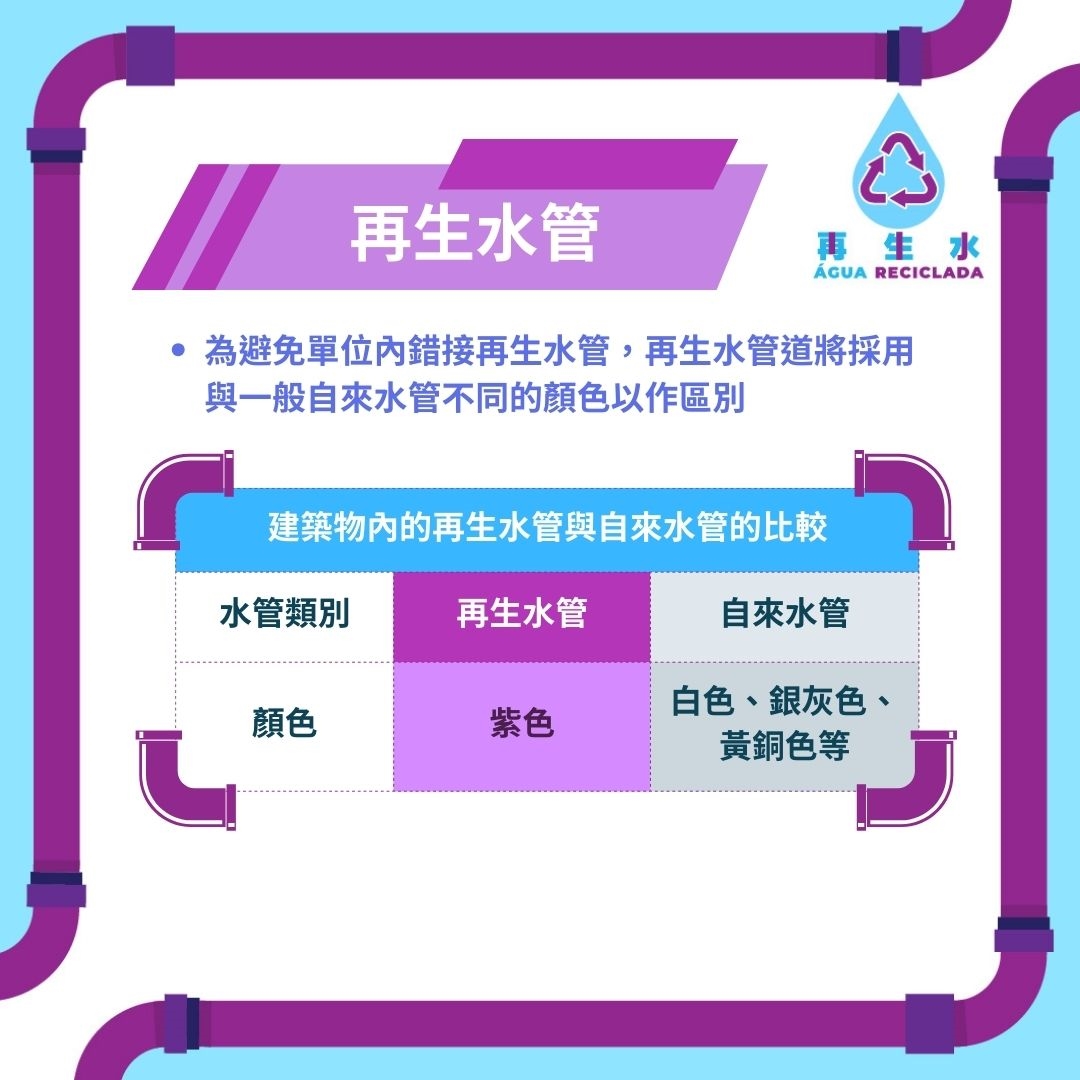 為避免單位內錯接再生水管,再生水管道將採用與一般自來水管不同的顏色以作區別。