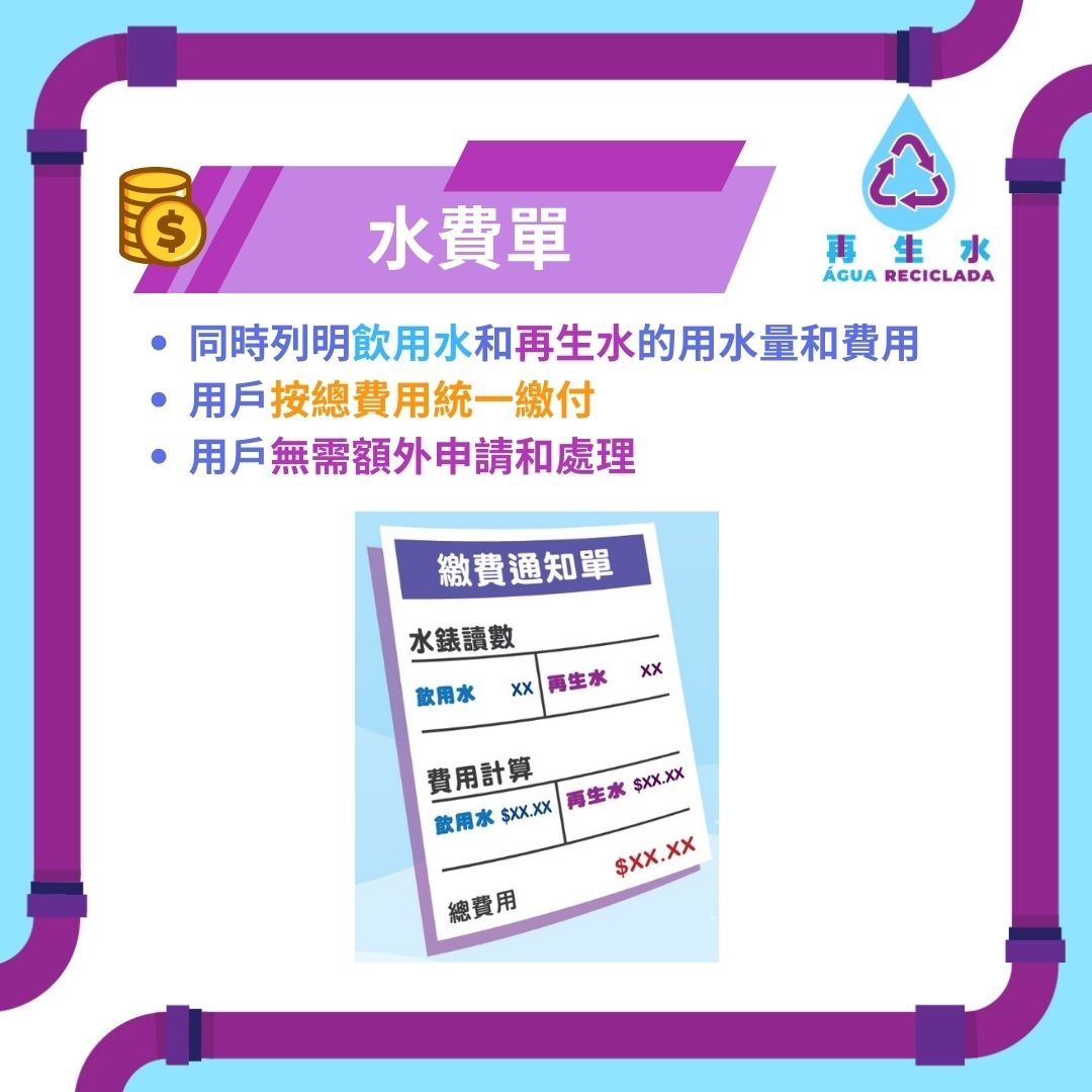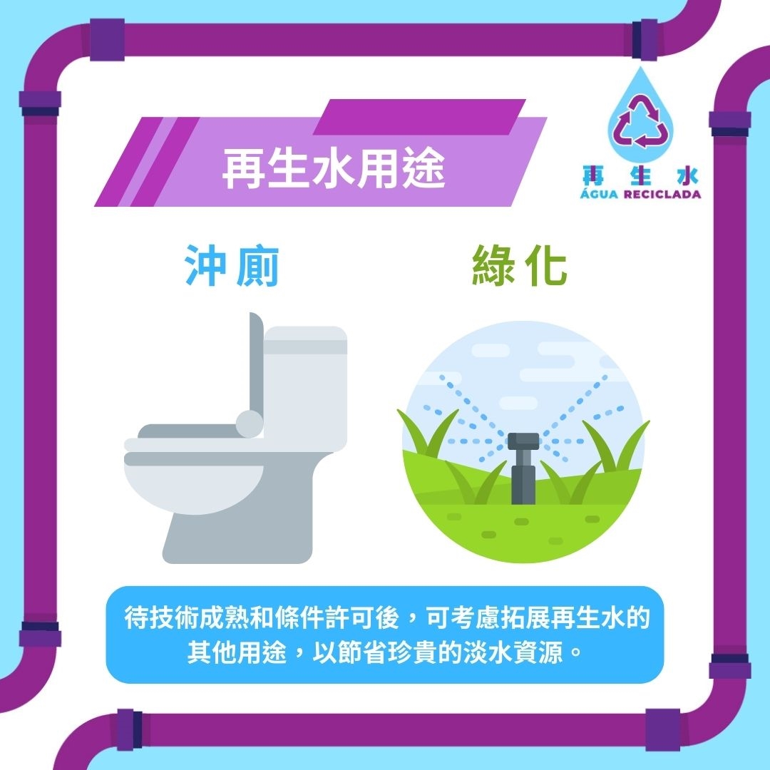 再生水是污水經過深化處理後可循環利用的水,作非飲用用途,如沖廁、綠化等。