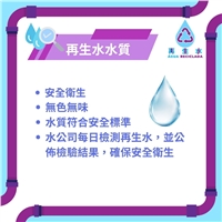 再生水水質標準是參考中華人民共和國國家標準《城市污水再生利用城市雜用水水質》(GB/T18920-2020)而訂定。再生水水質標準將包括微生物及消毒指標等,以滿足衛生安全的要求。